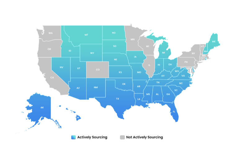 The map shows the states we are currently sourcing in. If your state is not colored in, we are not actively sourcing from that state right now: